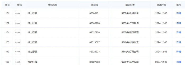 此外,格力电器申请注册多枚“格力好强”商标,国际分类涉及灯具空调、广告销售、机械设备等。